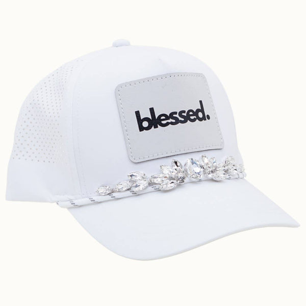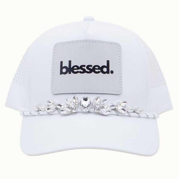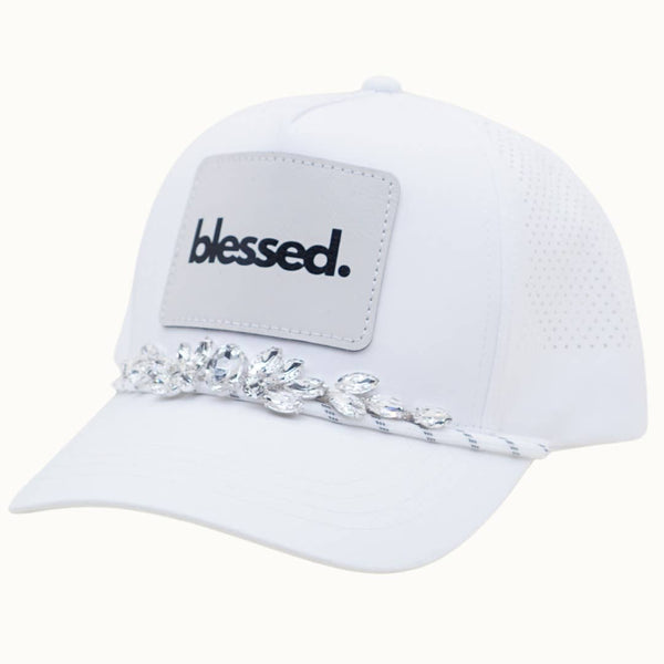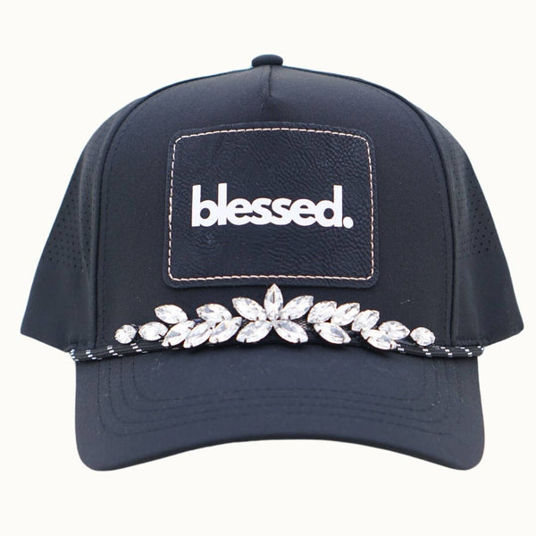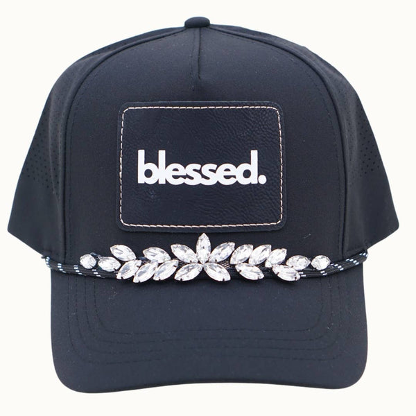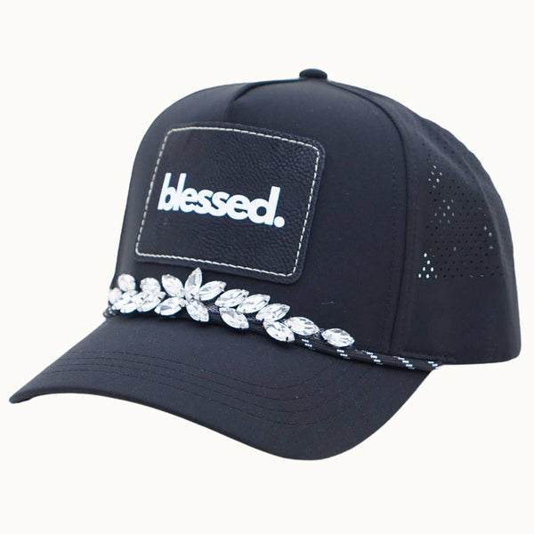 BLESSED- Bejeweled glitz athletic trucker cap with leatherette detail. 100% polyester for comfort, performance and style. Fused buckram backing, laser perforation for enhanced airflow, two-tone braided rope and a moisture-wicking sweatband that keeps you cool and dry. Adjustable plastic snapback, osfm.