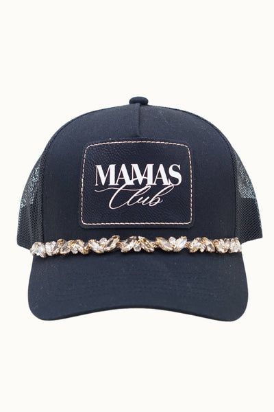 MAMAS CLUB - Bejeweled glitz trucker cap with leatherette detail. 65% cotton and 35% polyester, plastic adjustable snapback, osfm.