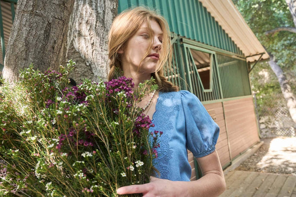 V NECKLINE BUTTON DOWN SHORT PUFF SLEEVES FLORAL EMBROIDERY PATTERN CROPPED CHAMBRAY PATTERN WOVEN TOP NOT LINED 100%LYOCELL