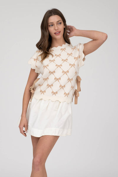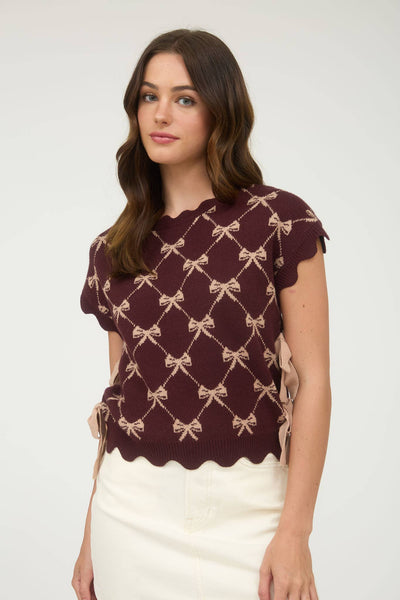 ROUND NECKLINE SHORT SLEEVES DROP SHOULDER SCALLOP EDGE SIDE TIE DETAIL BOW PATTERN NOT LINED PULLOVER SWEATER 52% RAYON, 28% POLYESTER, 20% NYLON EXCLUSIVE OF DECORATION