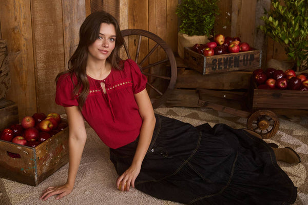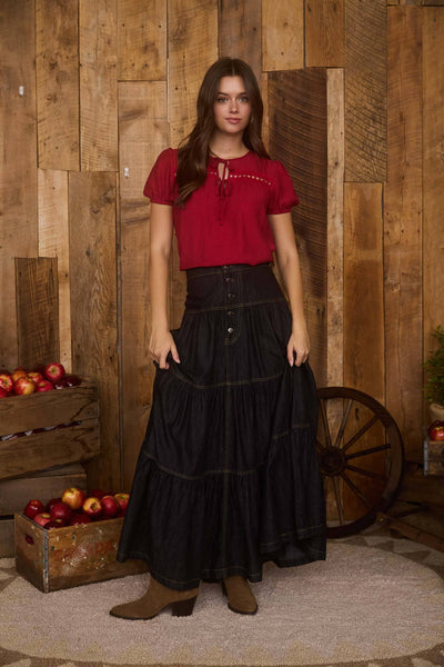 V NECKLINE SHORT PUFF SLEEVES EYELET LACE TRIM DOUBLE FRONT TIE DETAIL NOT LINED SOLID WOVEN TOP SELF: 80%RAYON,20%NYLON CONTRAST: 100%POLYESTER