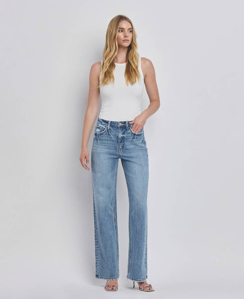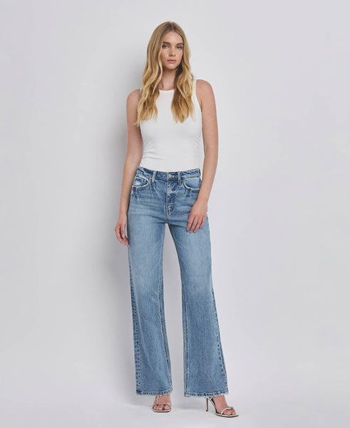 90'S SUPER HIGH RISE WIDE JEANS COMFORT STRETCH DENIM, SUPER HIGH RISE WAIST, LIGHTLY DISTRESSED DETAIL, FINISHED HEM, FULL LENGTH, 90'S WIDE JEANS F.