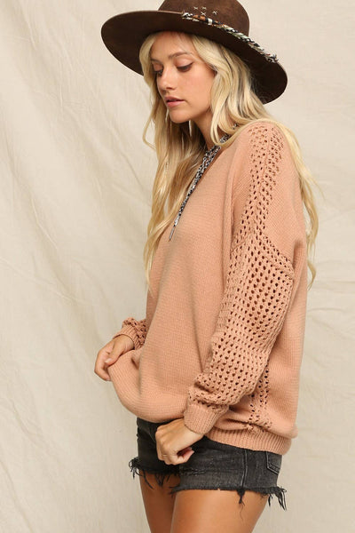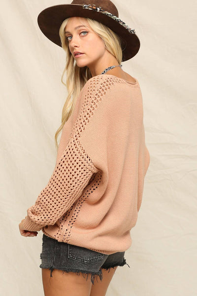 Oversize light feeling contemporary knit sweater with V-neckline, ribbed long sleeves, small hole details all over sleeves, shoulder, and side. Body Size: Contemporary Pattern: Solid Length: Long Sleeve Style: V-Neck Fabric: 100%ACRYLIC
