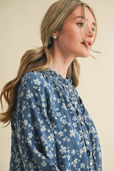 Dressing chic comes easy when you’re styling with this denim floral ruffled top! Denim floral fabric shapes a high ruffled neckline with a button down placket lined with ruffle trim. Relaxed bodice is framed with raglan seam long puff sleeves with smocked cuffs. Pair with any bottoms to achieve an effortlessly pulled-together look! + Denim floral ruffled button down top + High ruffled neckline with ruffled button down placket + Raglan seam long puff sleeves with smocked cuffs + Relaxed fit