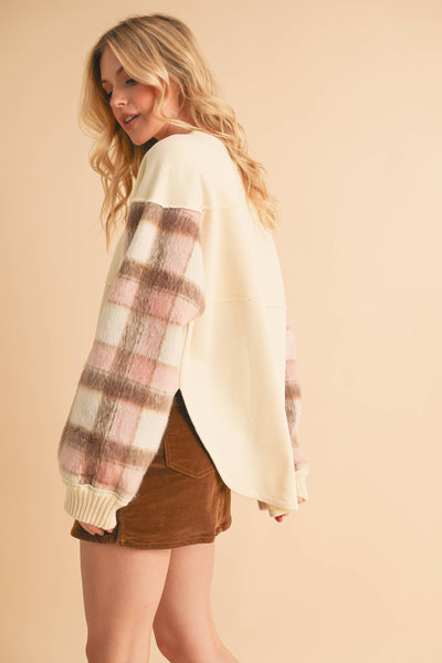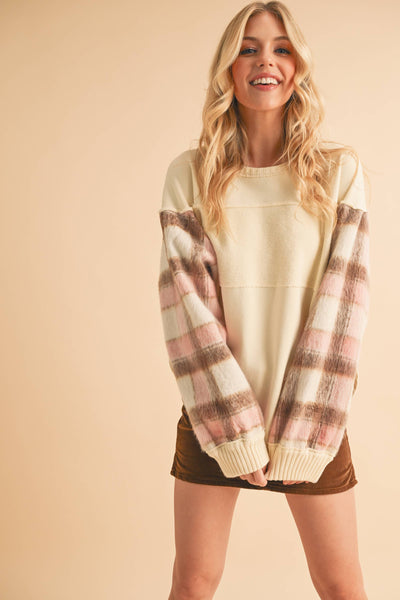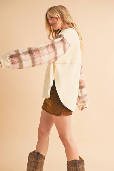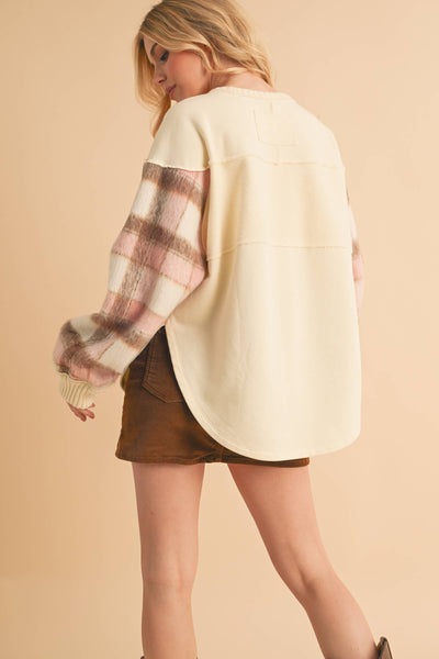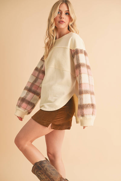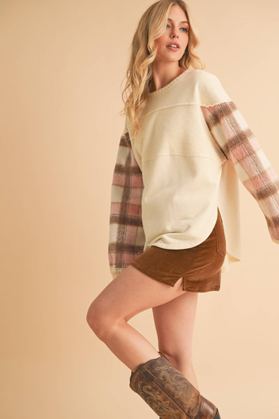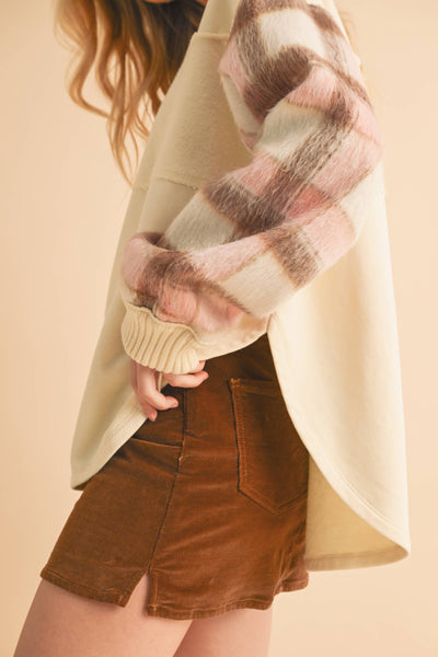 Cozy up in this unique Malva sweatshirt with soft, plaid-accented sleeves, blending comfort and style effortlessly. Paired with a rich brown corduroy mini skirt, it’s the perfect balance of warmth and flair for those cooler days.