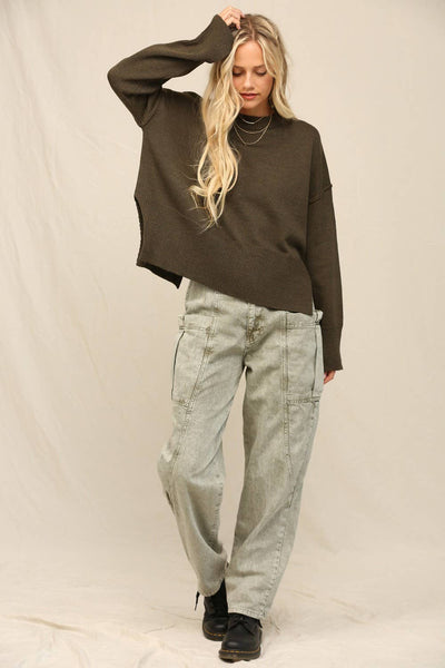 A crewneck and open slit sleeves and back center lend modern style to a slightly cropped sweater. Body Size: Contemporary Pattern: Solid Length: Long Sleeve Style: Round Neck Fabric: 70%POLYESTER 30%ACRYLIC