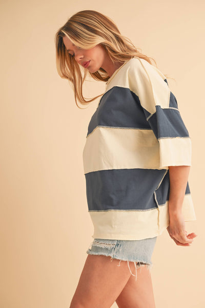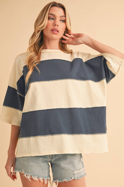 This relaxed-fit T-shirt features bold navy and cream stripes with exposed seams for a casual, effortless vibe. Its oversized silhouette and breezy style make it perfect for pairing with denim shorts or leggings.