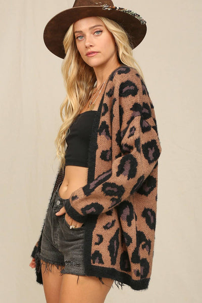 This cozy cardigan features our favorite leopard print. Body Size: Contemporary Pattern: Animal Length: Long Sleeve Style: Wrap Fabric: 50%ACRYLIC 50%POLYESTER