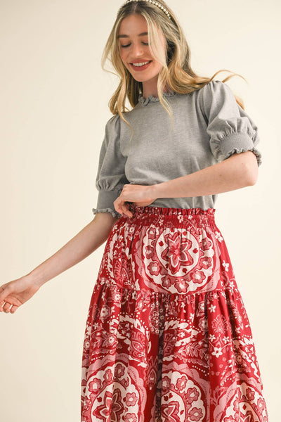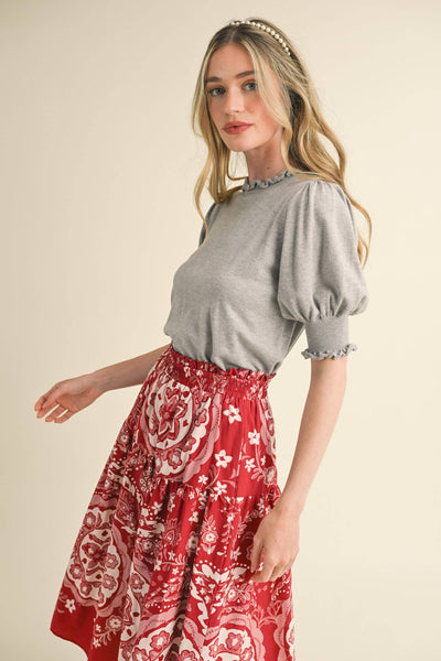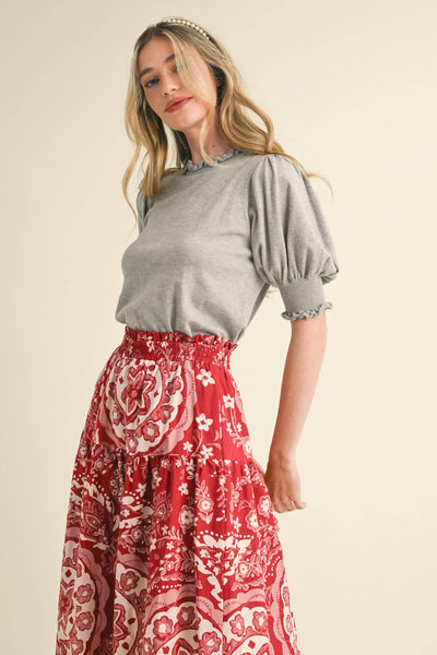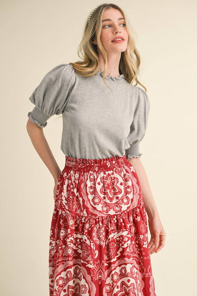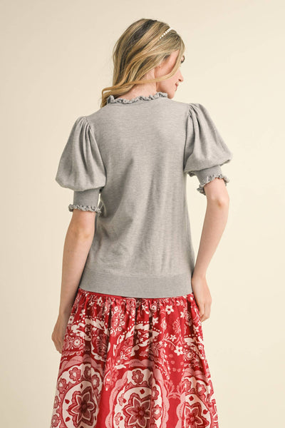 Add a chic upgrade to your everyday look with this ruffled puff sleeve sweater! Soft knit shapes this sweater with short puff sleeves that boast ruffled cuffs and a ruffled round neckline. Semi-fitted bodice makes this sweater top easy to tuck into high-wasted bottoms. Style with a maxi skirt for an elegant boho-chic look, or pair with jeans for an effortless vibe! + Ruffle trim puff sleeve sweater + Ruffled round neckline + Short puff sleeves with fitted ribbed cuffs + Ruffle detail on cuffs + Ribbed neckline, cuffs, and hem + Semi-fitted bodice