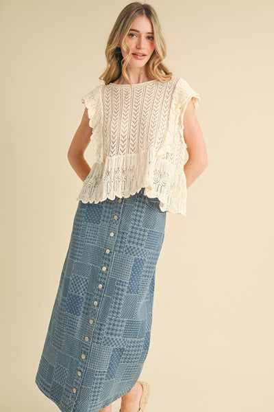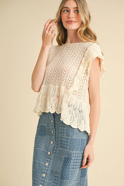 Carefree and cute, this flutter sleeve pointelle sweater top will add a little extra sweetness to your look! Loose pointelle knit with a Boho-inspired design sweeps across the relaxed bodice that forms a rolled round neckline, short flutter sleeves, and a flared hem. Back detail features a crossover hem. Pair these sweater top with any bottoms for a modern boho vibe!