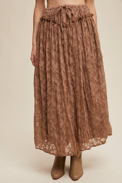 Allover Burnout Floral Fabric: Features a semi-sheer floral burnout texture for a romantic, vintage-inspired look - Relaxed Maxi Silhouette: Flowy A-line cut drapes beautifully for easy, graceful movement - Ruffle Trim Waistband: Soft ruffle detail along the waist adds a feminine, whimsical touch - Elastic Waist with Drawstring: Stretch waistband with adjustable tie ensures a comfortable, flexible fit - Functional Side Pockets: Discreet side pockets add everyday convenience without disrupting the silhouette - Fully Lined: Includes a full lining for comfortable coverage and worry-free wear - Model is 5' 7.5" 34-24-34 and wearing a size Small With its dreamy texture and flowing shape, this skirt channels effortless boho charm and pairs beautifully with western-inspired boots for a free-spirited look.
