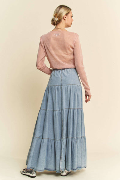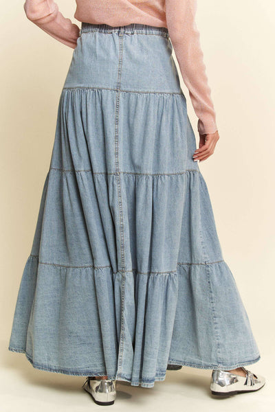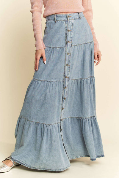 DENIM BUTTON FRONT RUFFLE HEM DENIM MAXI SKIRT 100%COTTON