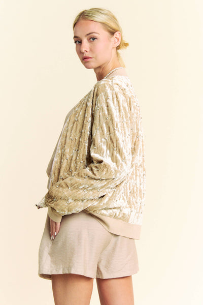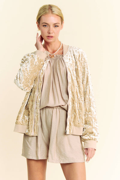 QUILTED STONE EMBELLISHED CRUSHED VELVET EXPOSED ZIPPER FRONT BOMBER JACKET 100%POLYESTER/100%POLYESTER Model is wearing Small Height: 5'10" Bust : 34 Waist : 25" Hips : 35"