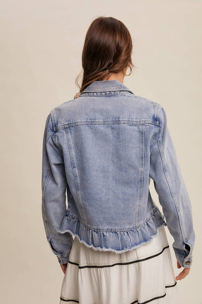 Classic collared neckline for a timeless look - Soft, faded denim with vintage-inspired wash - Button-down front with metal hardware for a structured finish - Functional chest flap pockets for added practicality - Feminine ruffled hem with raw-edge detailing - Long sleeves with buttoned cuffs for adjustable styling - Comfortable and lightweight, perfect for layering - Model is 5' 7.5" 33-24-34 and wearing a size Small A chic take on a wardrobe staple, this denim jacket blends classic structure with playful ruffle details, making it a stylish layering piece for any casual or dressy look.