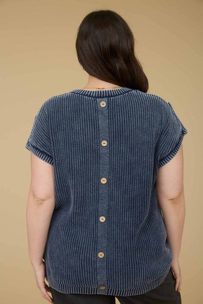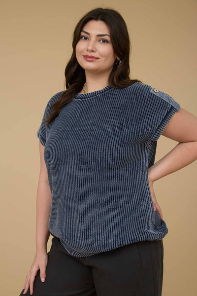 CREW NECKLINE SHORT SLEEVES TAB SLEEVE DETAIL RELAXED FIT RIBBED TRIM DETAIL WASHED KNIT PATTERN KNIT PULLOVER SWEATER TOP 100%COTTON