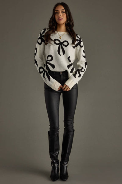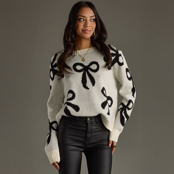 Cream knit sweater Black bow design on the front & back 100% Acrylic