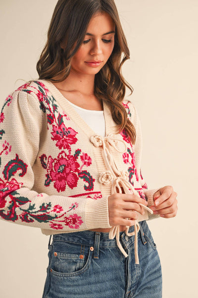 Floral knit tie-front cropped sweater cardigan, V neckline with triple bow tying closure, knit rosettes tying detail, gathered puff shoulders, fitted long sleeves, floral border knit design, cropped fit