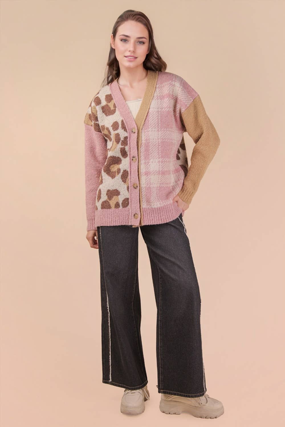 Oversized Leopard & Plaid Graphic Knit Sweater Cardigan