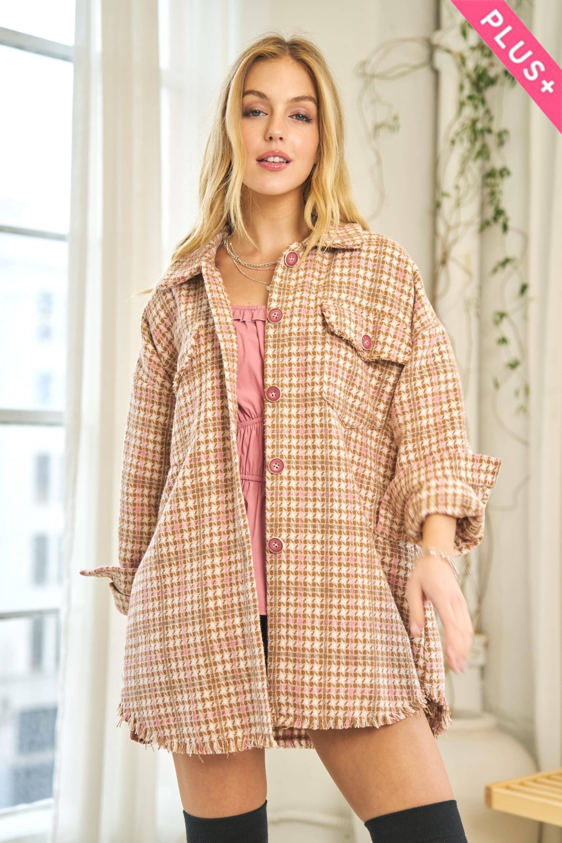 PLUS PLAID LONG SLEEVE JACKET WITH FRONT POCKET 100%POLYESTER