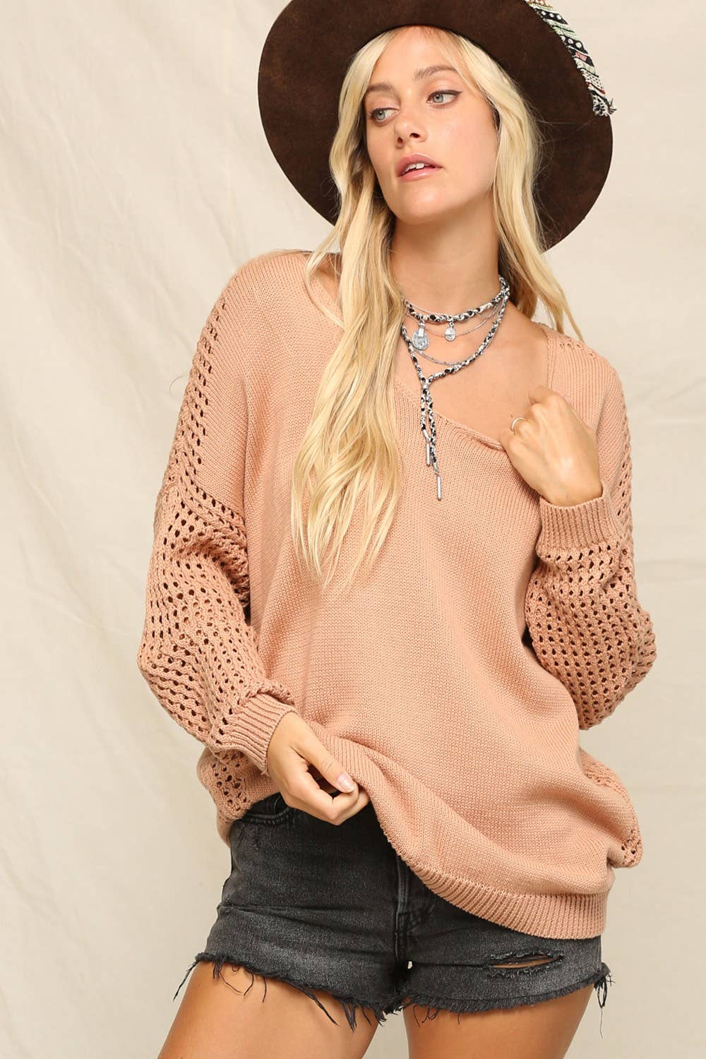 Oversize light feeling contemporary knit sweater with V-neckline, ribbed long sleeves, small hole details all over sleeves, shoulder, and side.