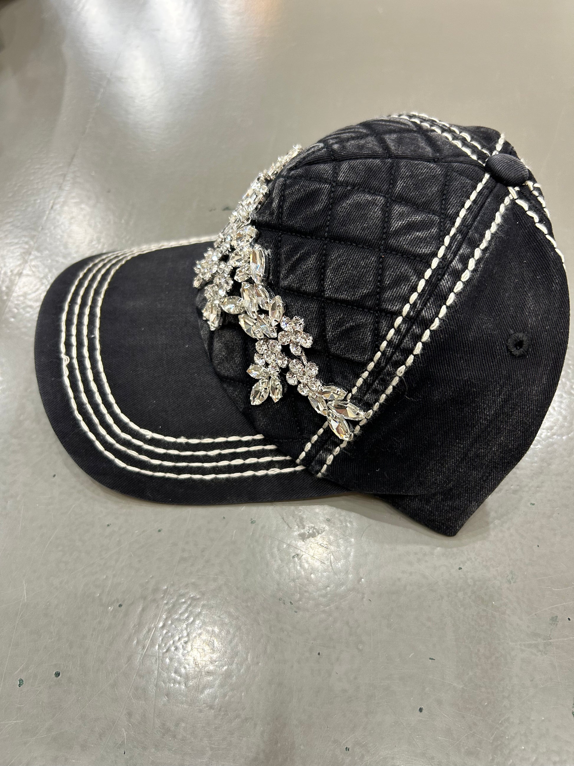 High quality stone deco on quilted front panel baseball cap with contrast stitching