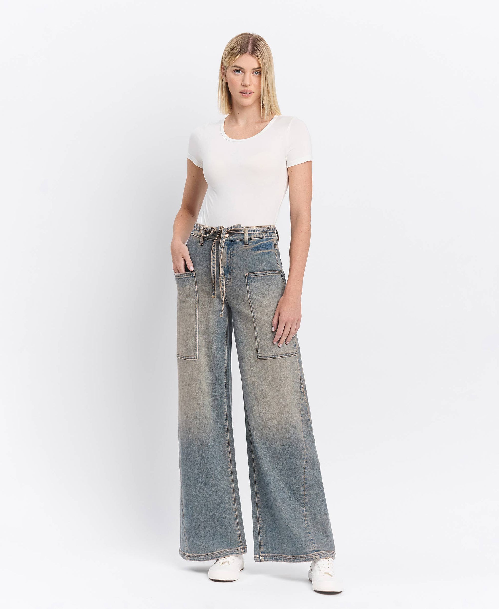 COMFORT STRETCH DENIM, HIGH RISE WAIST, ELASTIC TIE WAISTBAND, FRONT PATCH POCKET, FULL LENGTH, BAGGY WIDE JEANS