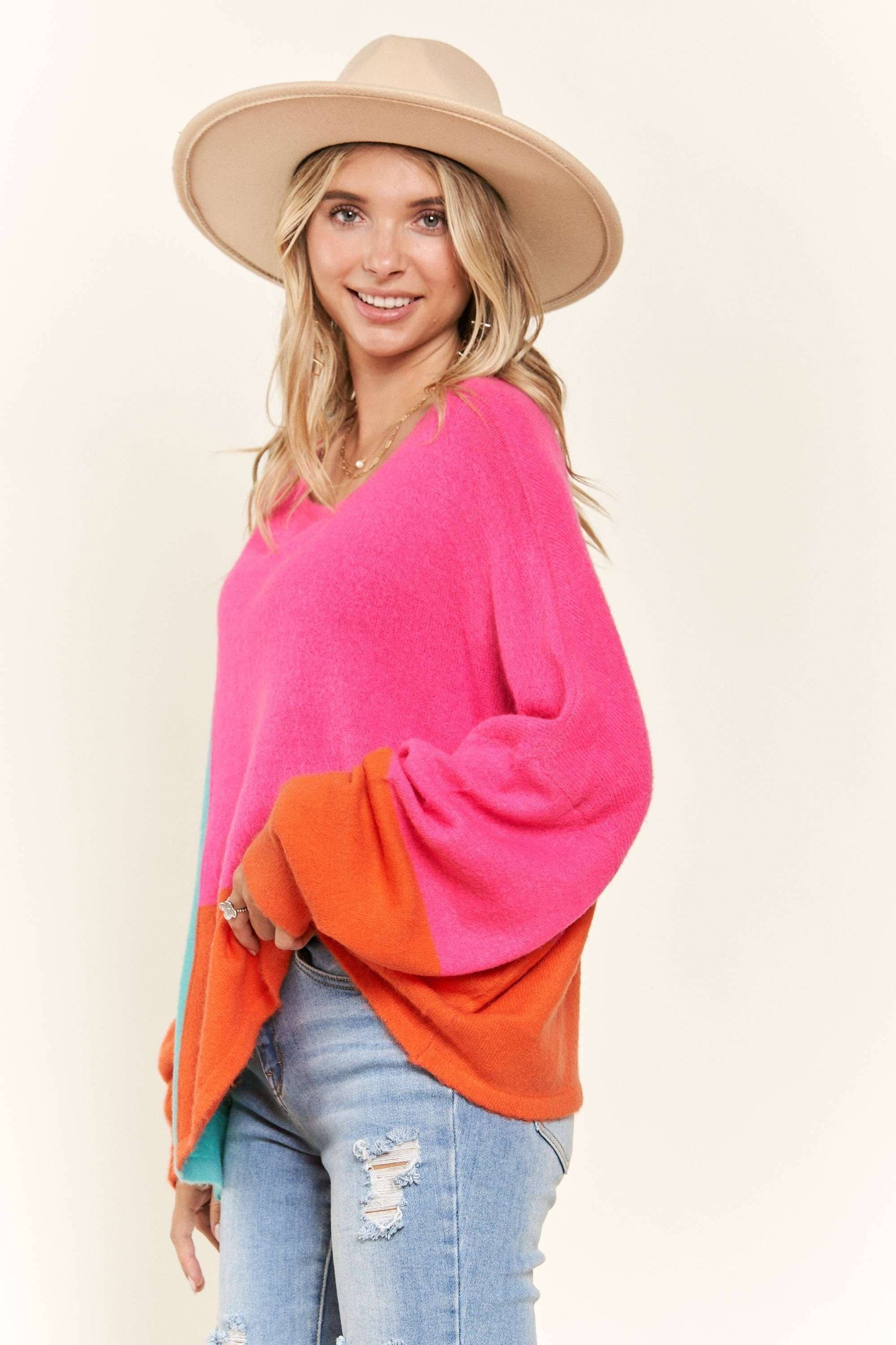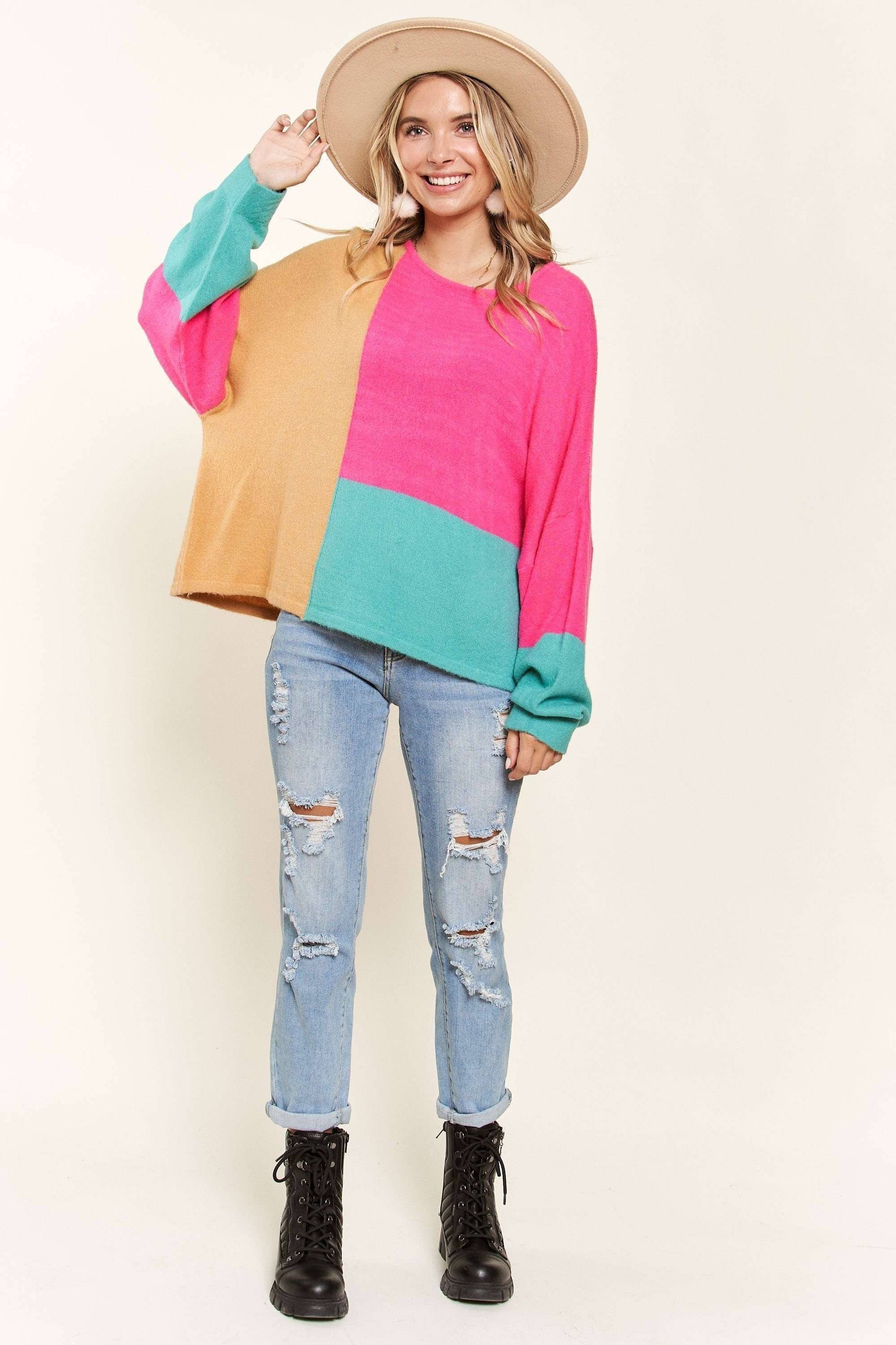LONG SLEEVES BOAT NECK LOOSE COLOR BLOCK SWEATER TOP