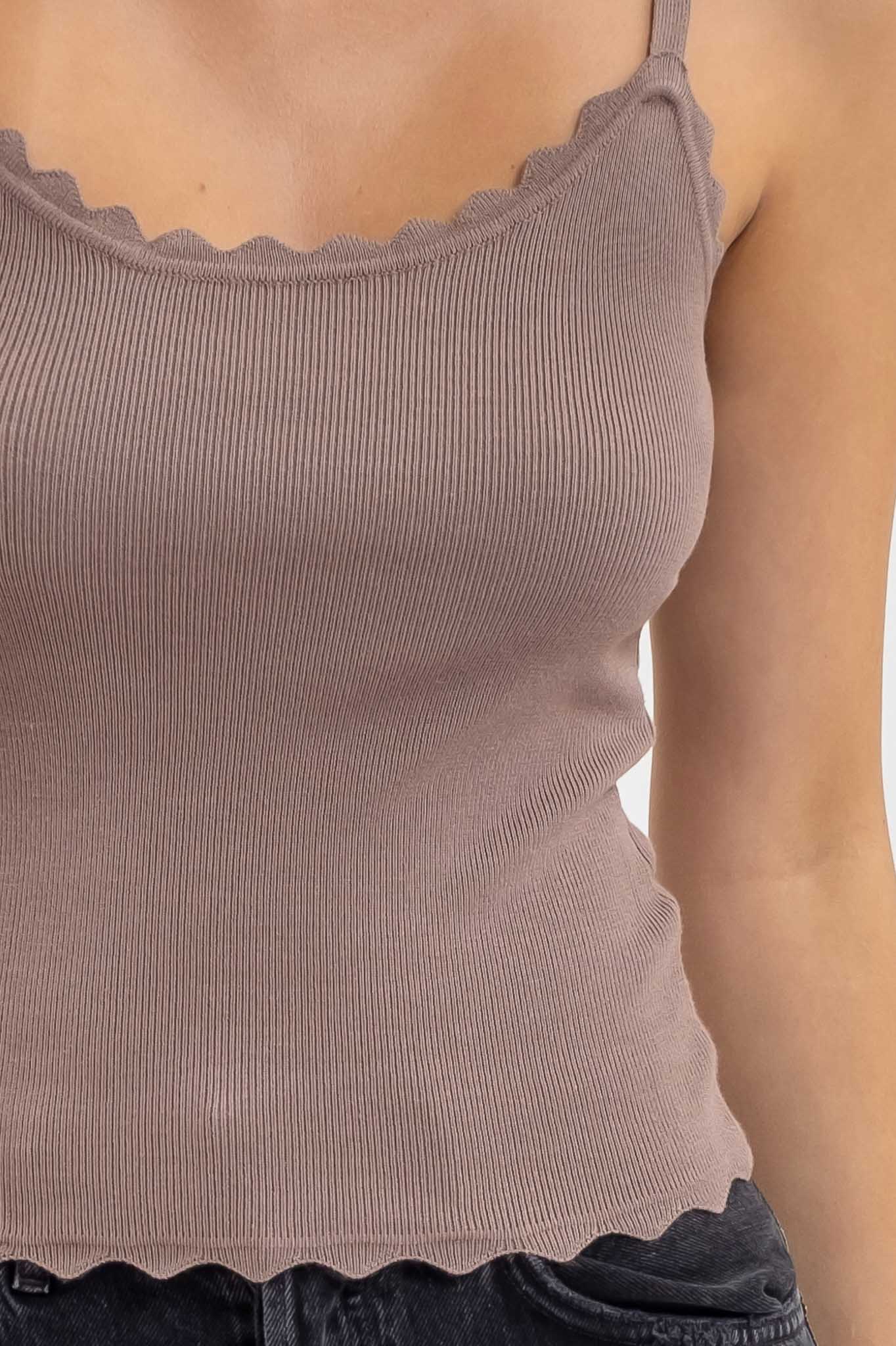 SCOOP NECKLINE - SPAGHETTI STRAP - SCALLOPED DETAIL - SOLID - 80% VISCOSE 20% POLYESTER