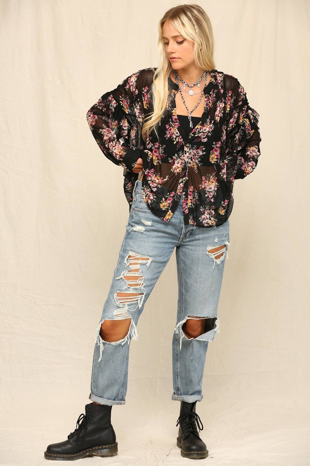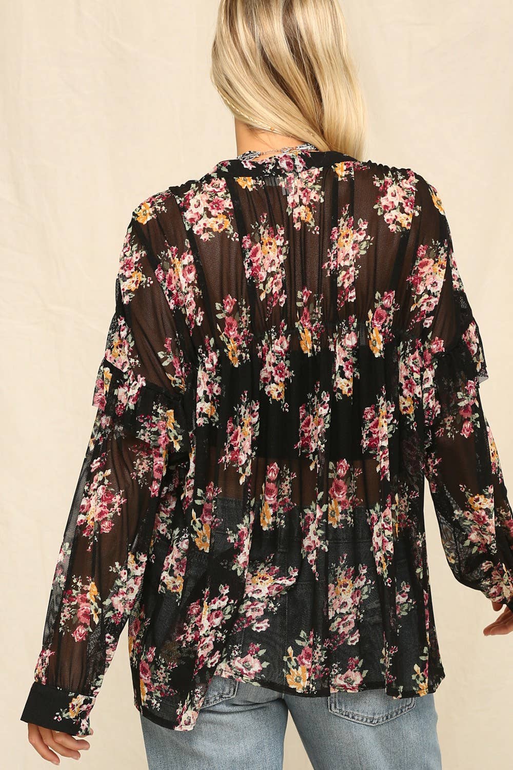 Stand out in this staple tunic featured in a flowy, button-front design with smock-inspired detailing. Pattern: Floral Length: Long Sleeve Style: Button Down, Mesh Fabric: 90%NYLON 10%SPANDEX