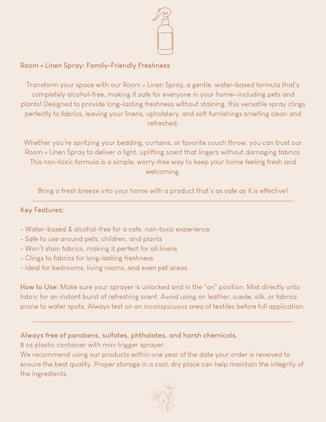 Transform your space with our Room + Linen Spray, a gentle, water-based formula that's completely alcohol-free, making it safe for everyone in your home—including pets and plants! Designed to provide long-lasting freshness without staining, this versatile spray clings perfectly to fabrics, leaving your linens, upholstery, and soft furnishings smelling clean and refreshed.